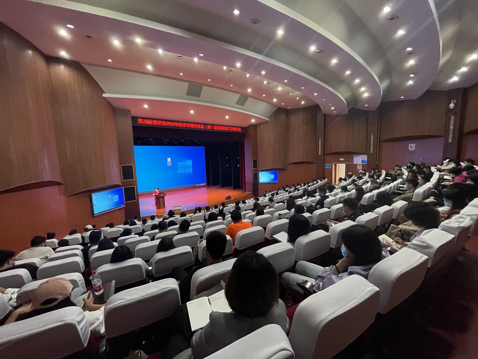 2022年9月26日下午,学校在艺术交流中心召开了2022年秋季学期学生返(到)校疫情防控工作准备会,四川传媒学院董事长张书玉,党委副书记、副校长刘黎,学生工作部、保卫处,全体辅导员老师参加了会议,会议由学生工作部(处)长唐杰主持。