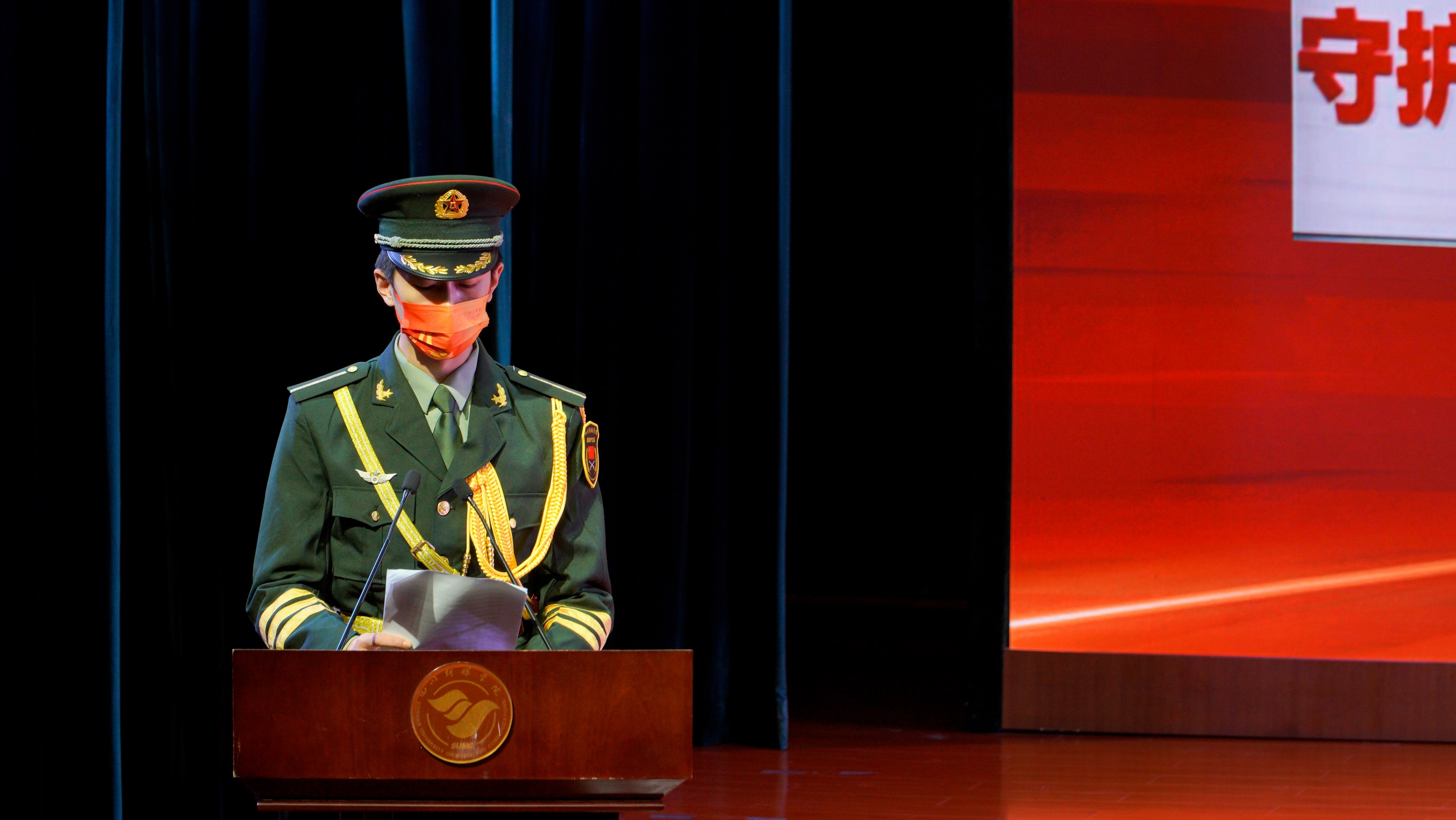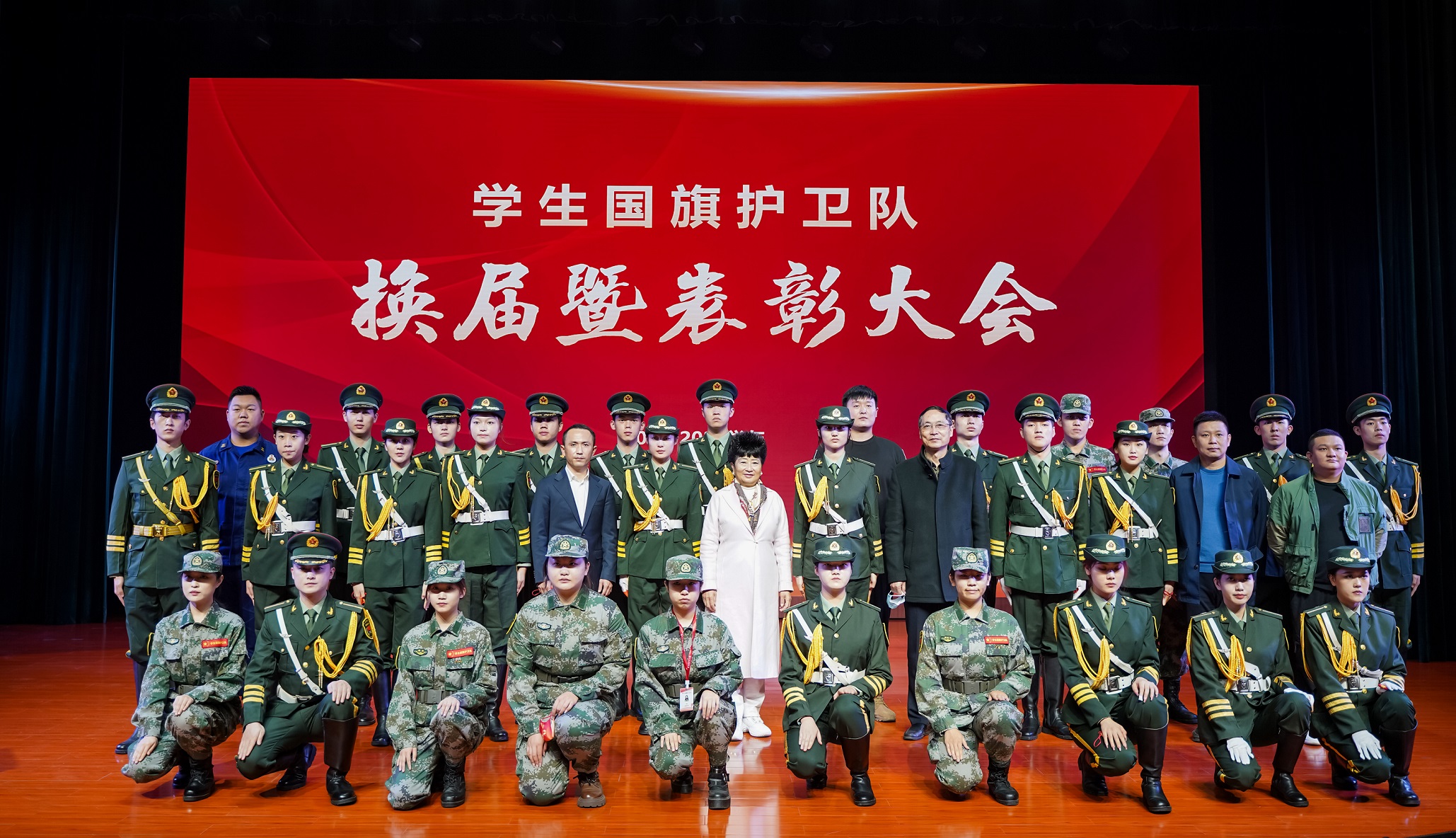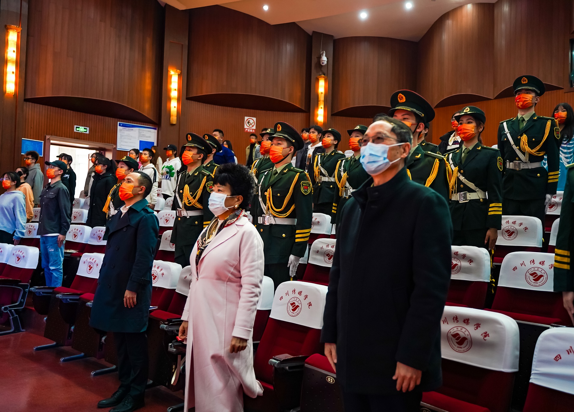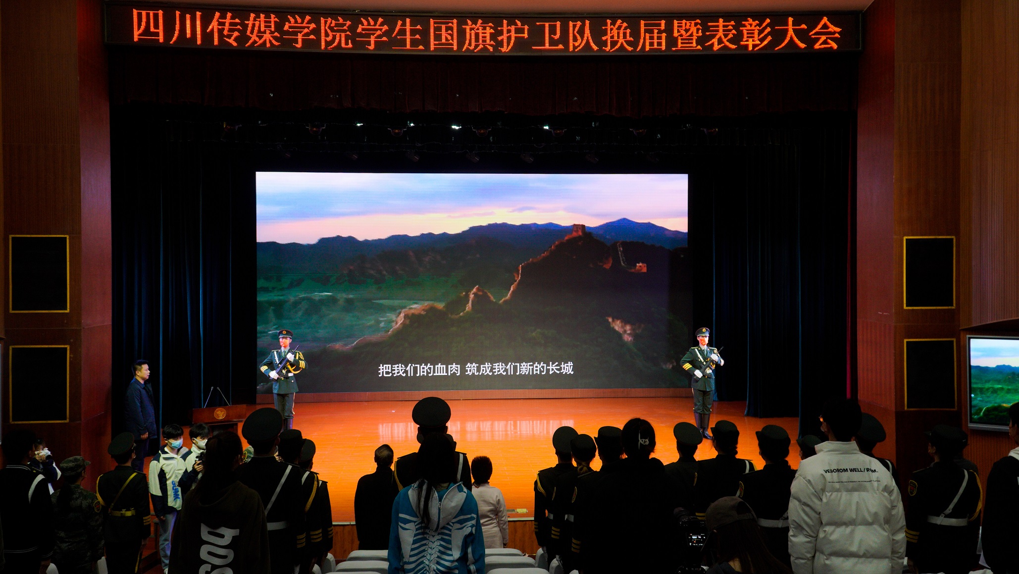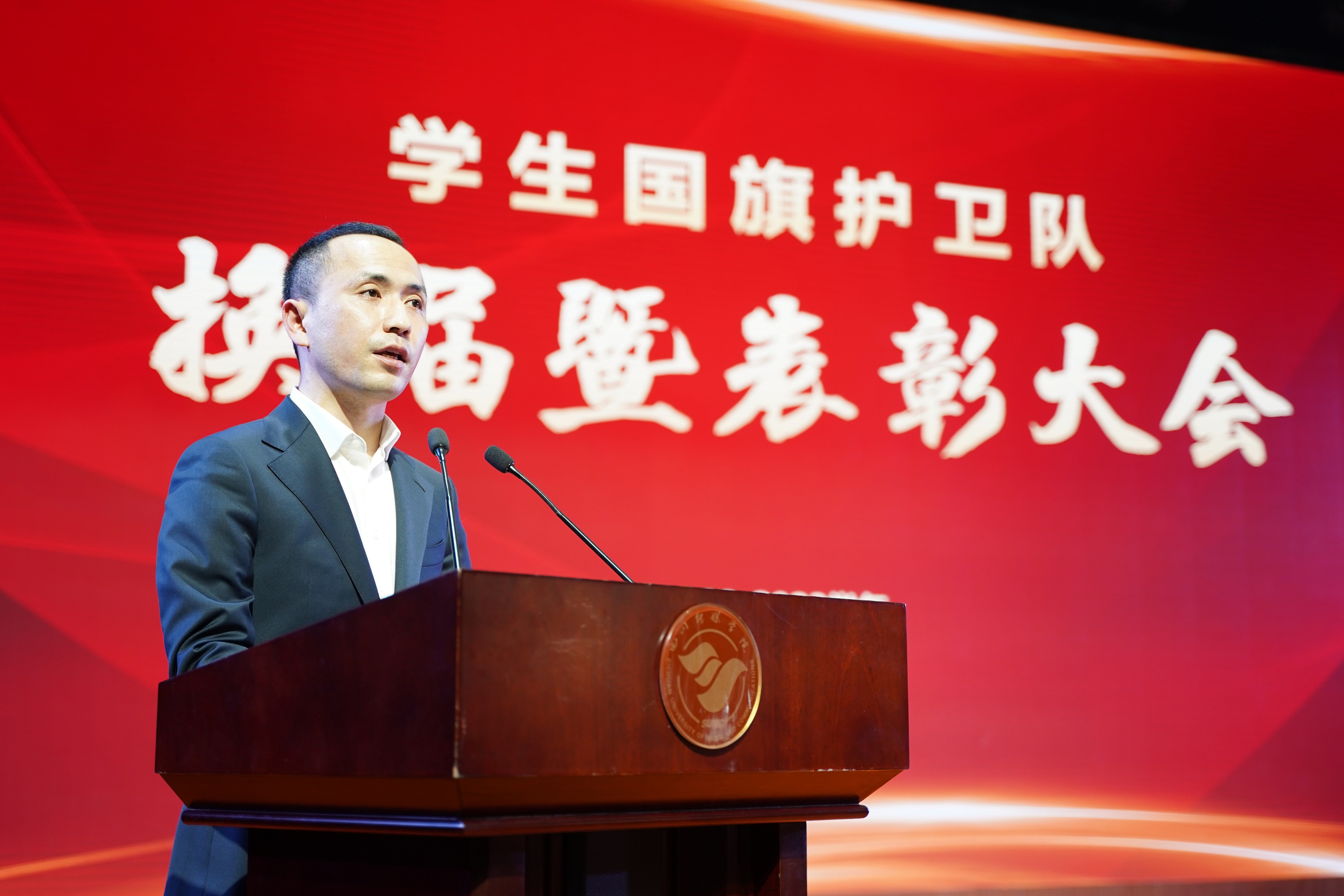 2022年11月15日上午,四川传媒学院学生国旗护卫队换届暨表彰大会在学校艺术交流中心顺利召开,四川传媒学院董事长张书玉,党委副书记、副校长刘黎,学生工作部(处)长唐杰出席会议。会议由保卫处副处长黄华主持。在庄严的国歌声中,会议正式开始。