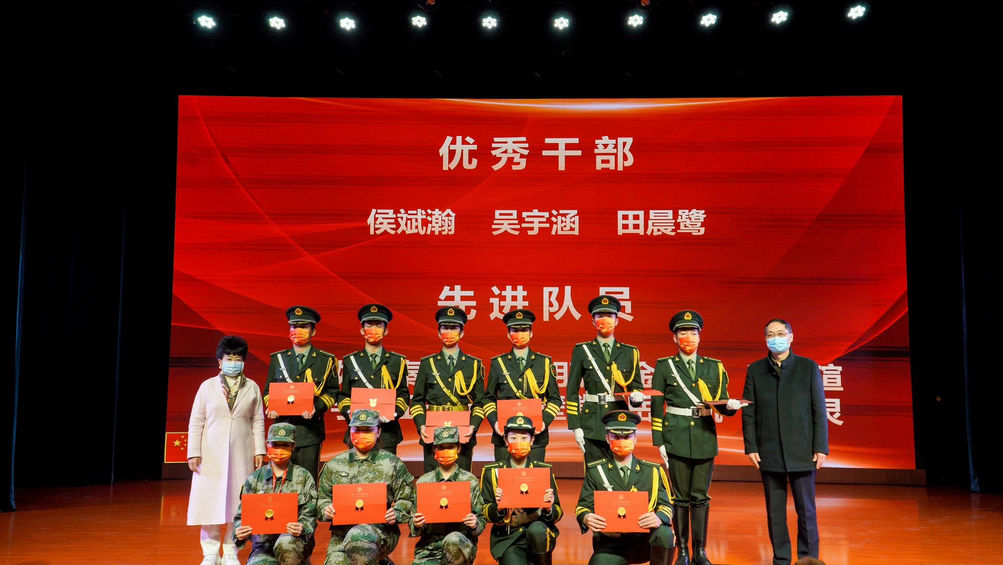 随后,大会对2021年的先进队员进行了表彰,黄华副处长宣读了表彰决定并公布了新一届新生干部名单。张书玉董事长和刘黎副校长为获得表彰的同学们颁发了荣誉证书。