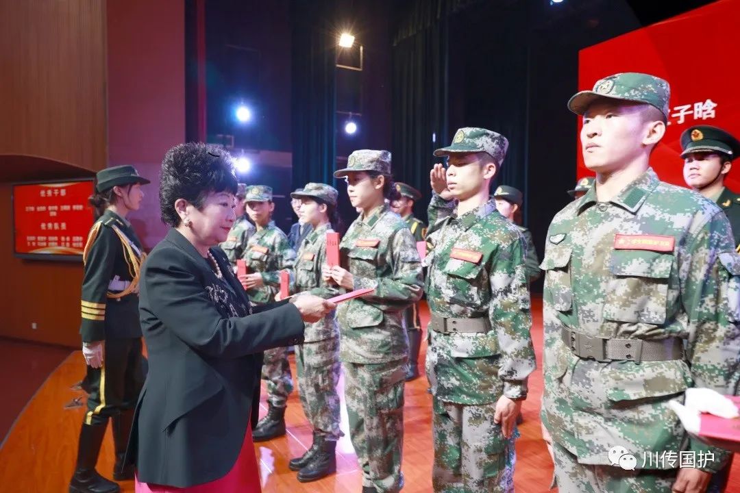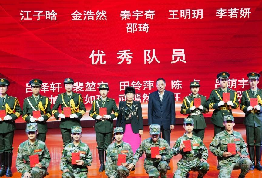 四川传媒学院理事长、常委副校长张书玉,党委副书记、副校长刘黎为学生国旗护卫队优秀学生干部颁发证书。