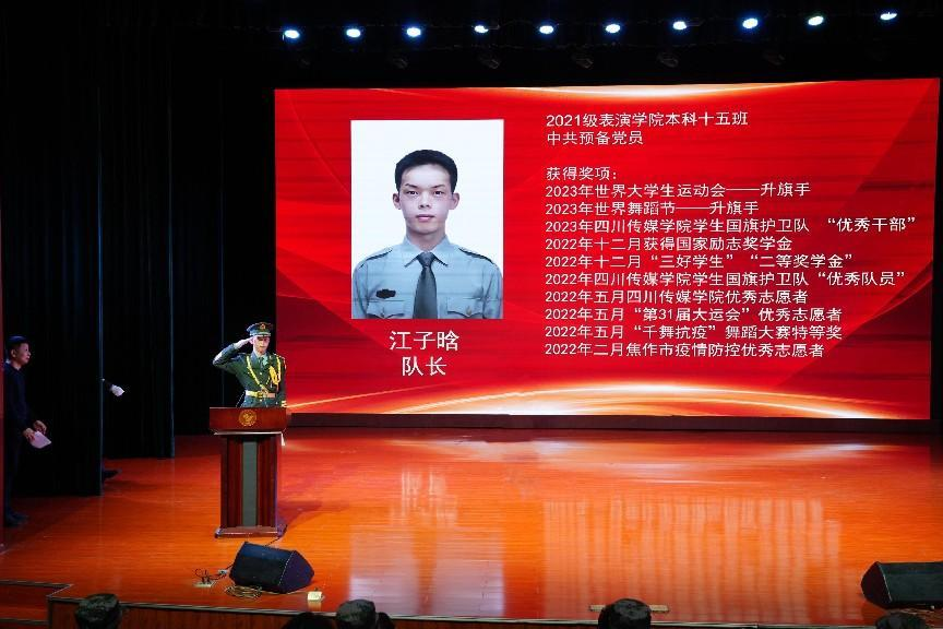 新一届学生国旗护卫队队长江子晗同学在大会上进行了发言,在发言中铿锵有力的说,年轻允许失败,尝试就是一种胜利。学生国旗护卫队是展示自己的大舞台。让我们共同恪守践行川传校训,展示青年风采,守护国旗荣誉,传承国旗精神的队训;去挑战一下自己吧,为我们的青春增添新的风采。随后由副队长赵晴带领全体队员进行了入队宣誓。