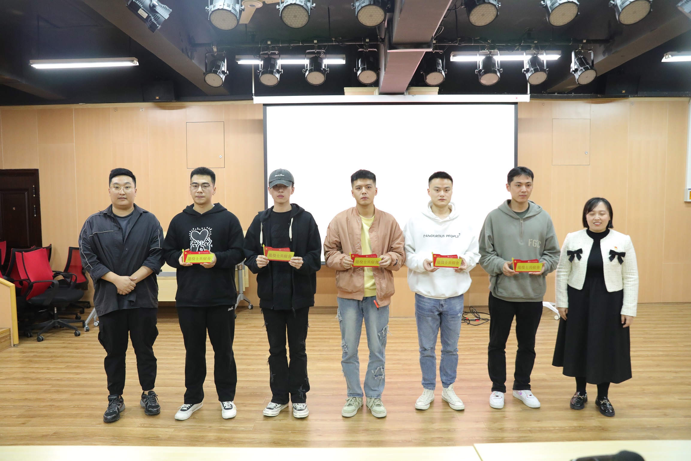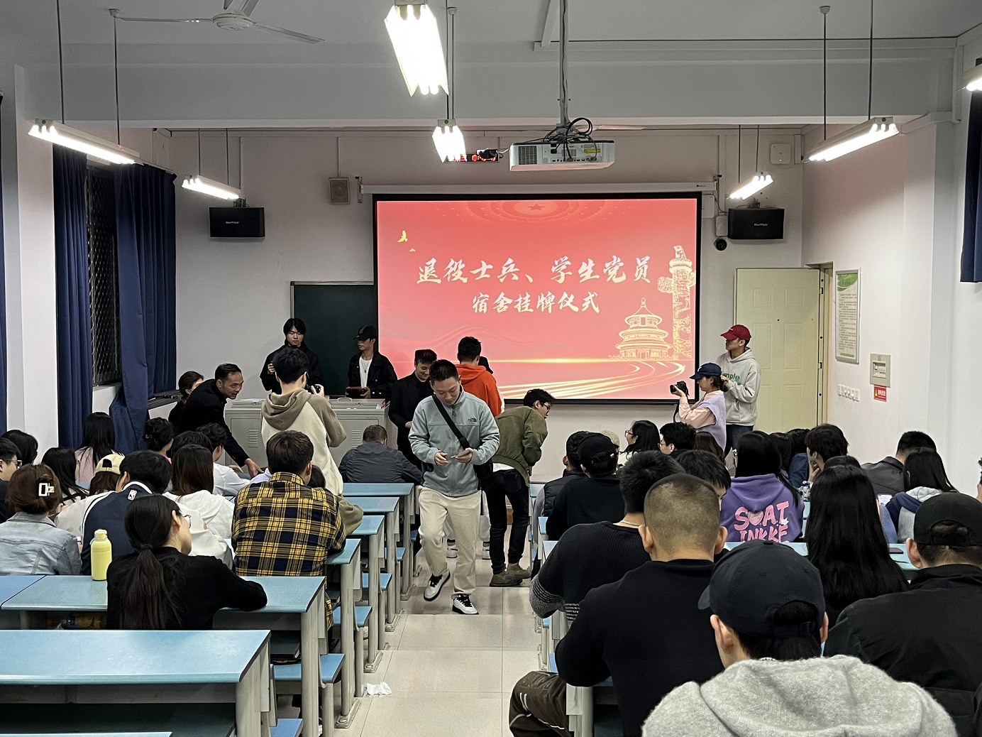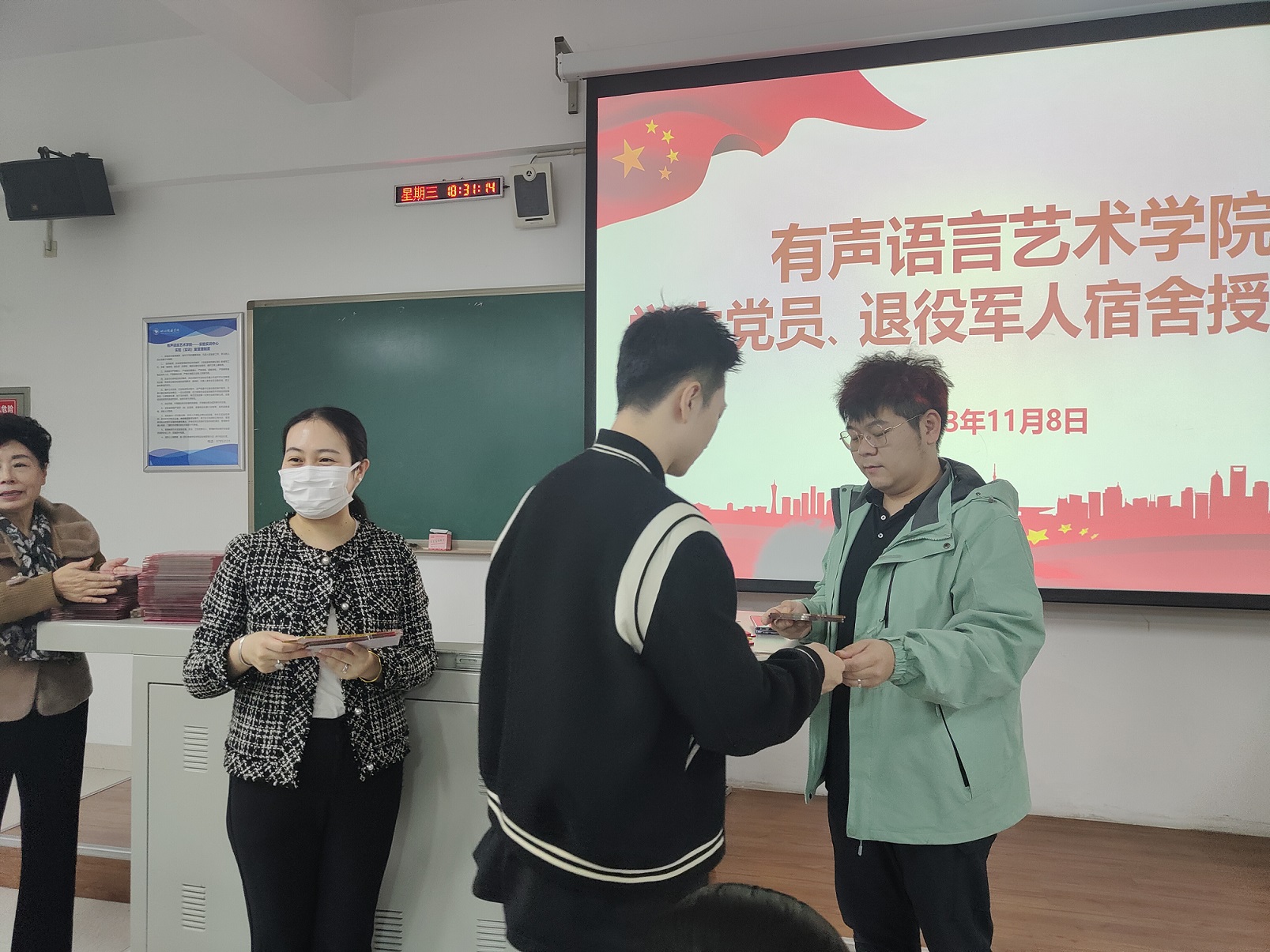 在充满荣誉感的氛围中,各院系部向那些在宿舍管理、卫生环境等方面表现突出的学生党员与退役士兵宿舍代表,颁发了精美的寝室门牌。彰显着他们在宿舍管理、卫生环境等方面的优秀表现。