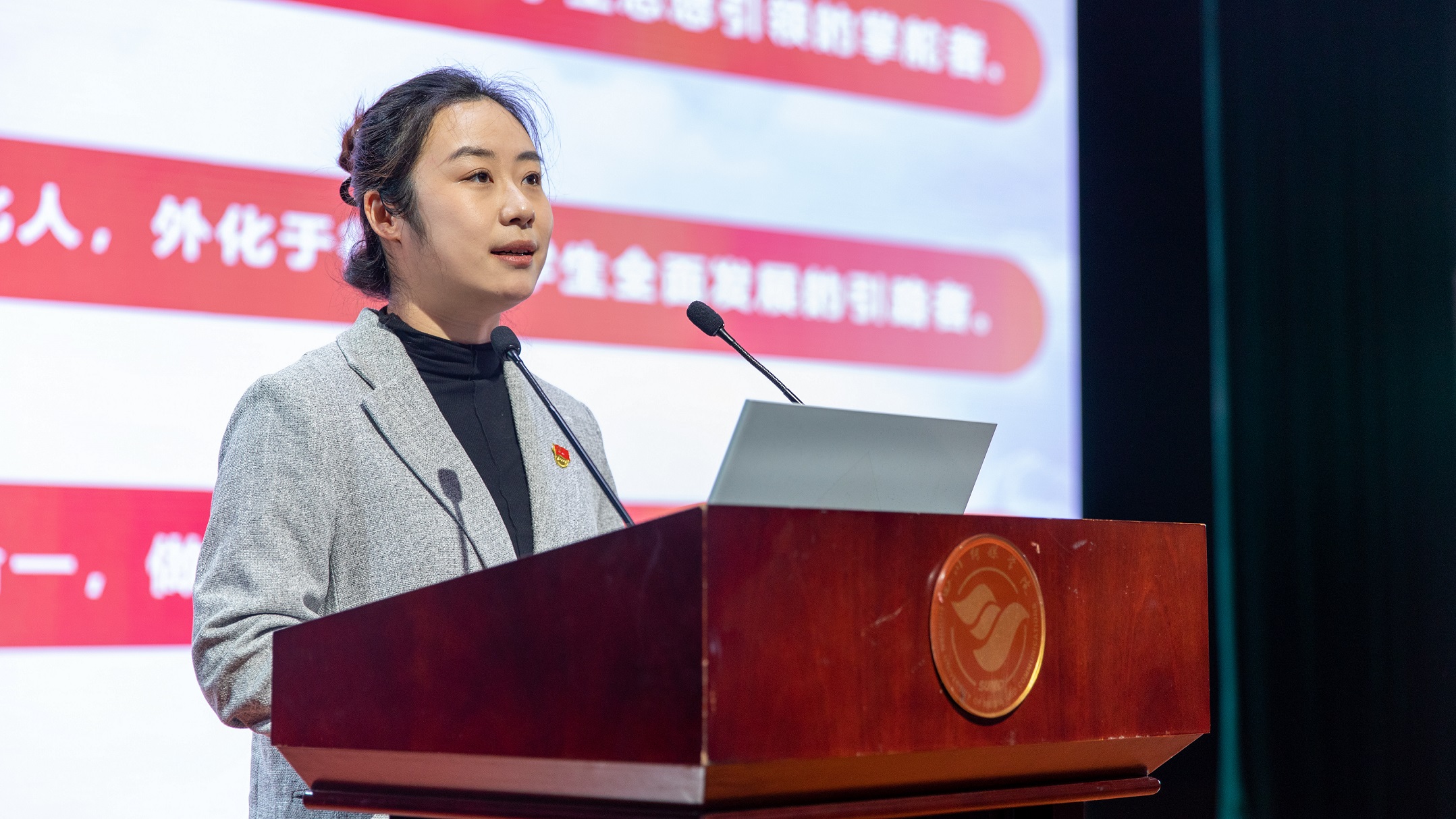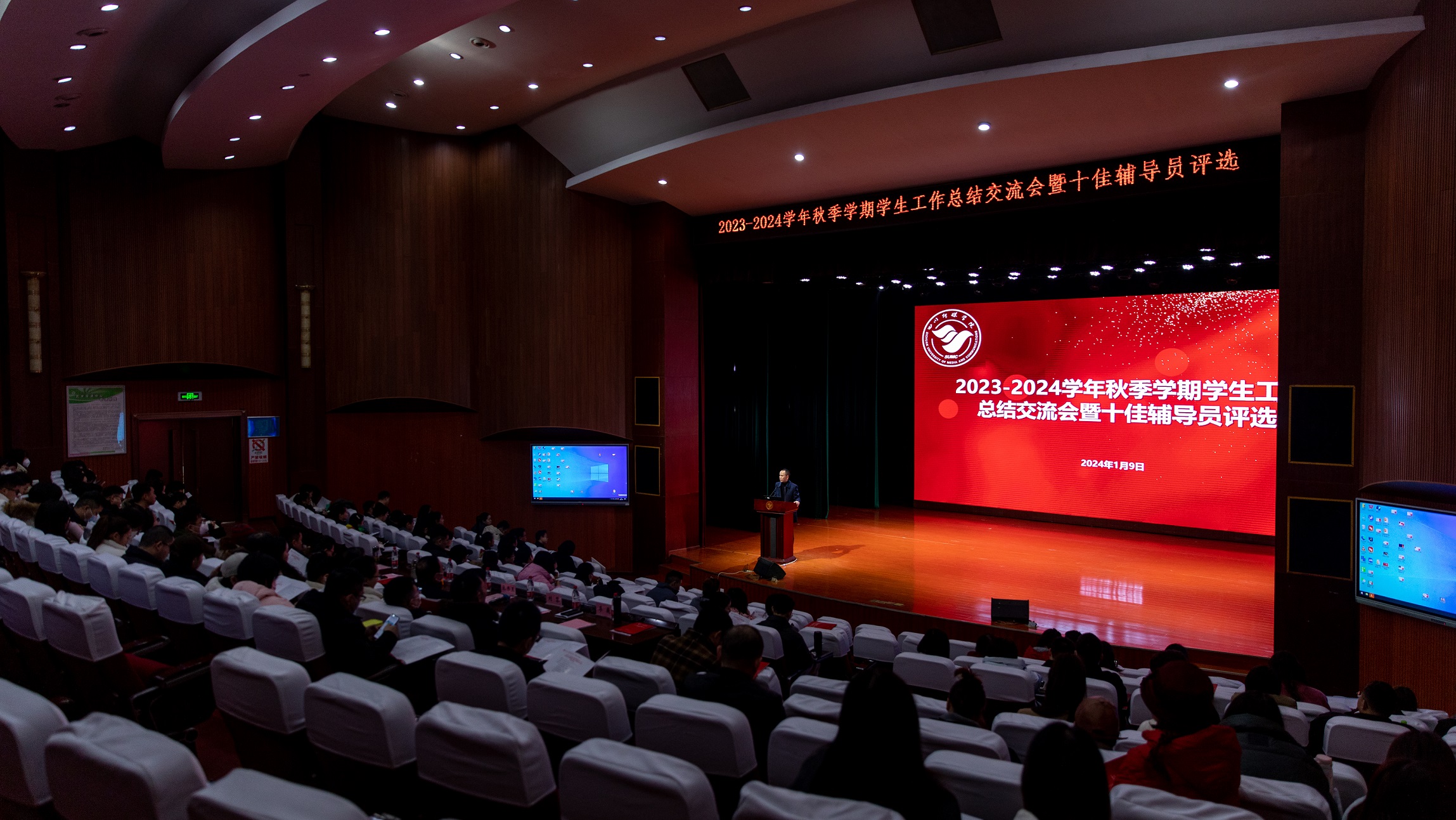 2024年1月9日,2023-2024学年秋季学期学生工作总结交流会暨十佳辅导员评选在艺术交流中心圆满举行。此次总结会场面隆重、气氛热烈,干货满满。同时,两年一届的四川传媒学院“十佳辅导员”评选也十分精彩,很好的展现了学生工作一线队伍的出色工作。这次会议的举行旨在回顾过去一年的学生工作,分享经验,表彰优秀,并共同探讨未来的发展。会议由党委常委、学生工作部(处)长唐杰主持,党委副书记、副校长刘黎,党委副书记、纪委书记陈俊明,副校长、工会主席李巍,团委书记周皓翔,保卫工作部(处)长黄华作为评委出席了会议,同时学工部全体,各院系部党委书记、副书记,全体辅导员老师也参加了会议。