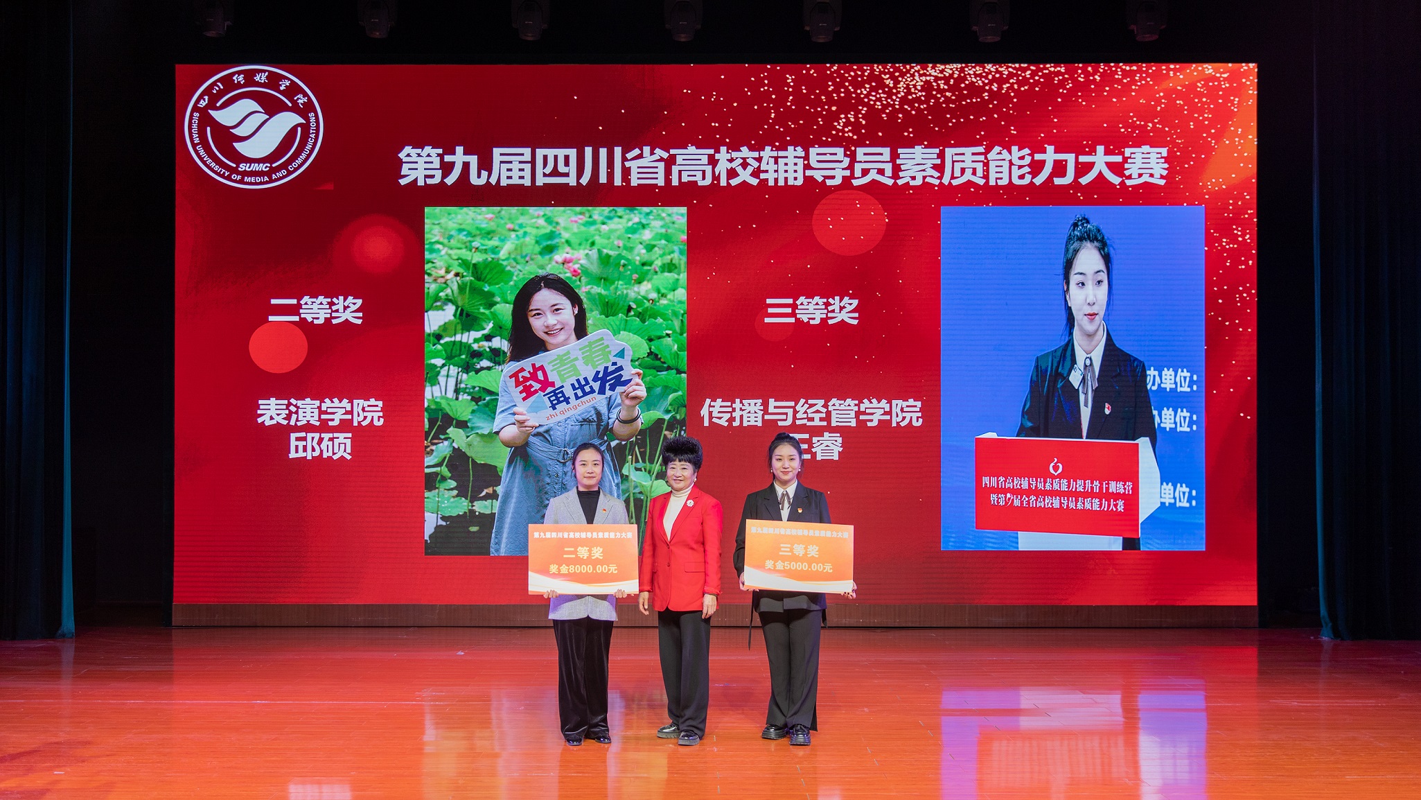 四川传媒学院理事长张书玉为我校参加第九届四川省辅导员职业能力大赛获奖老师颁发奖金