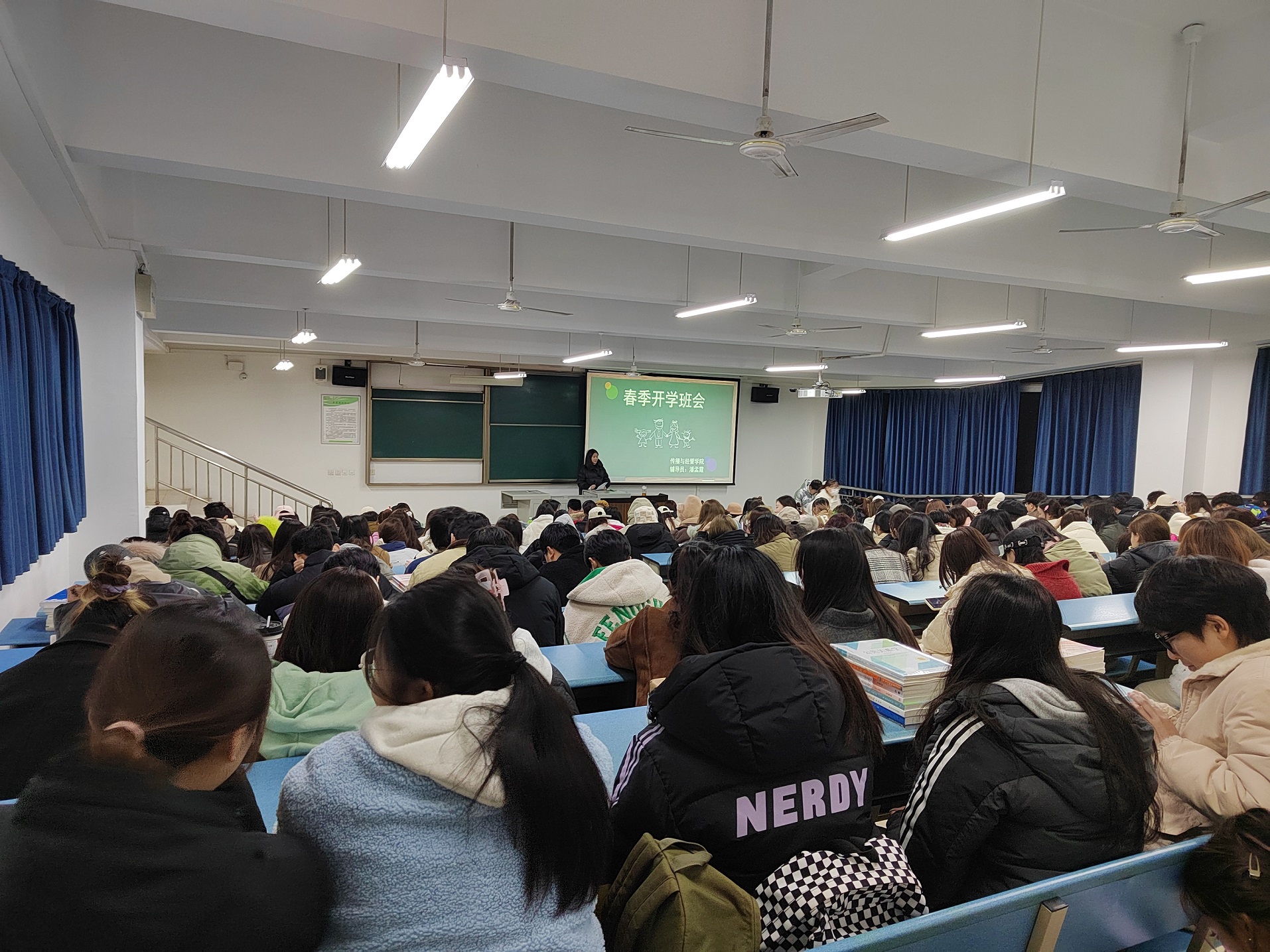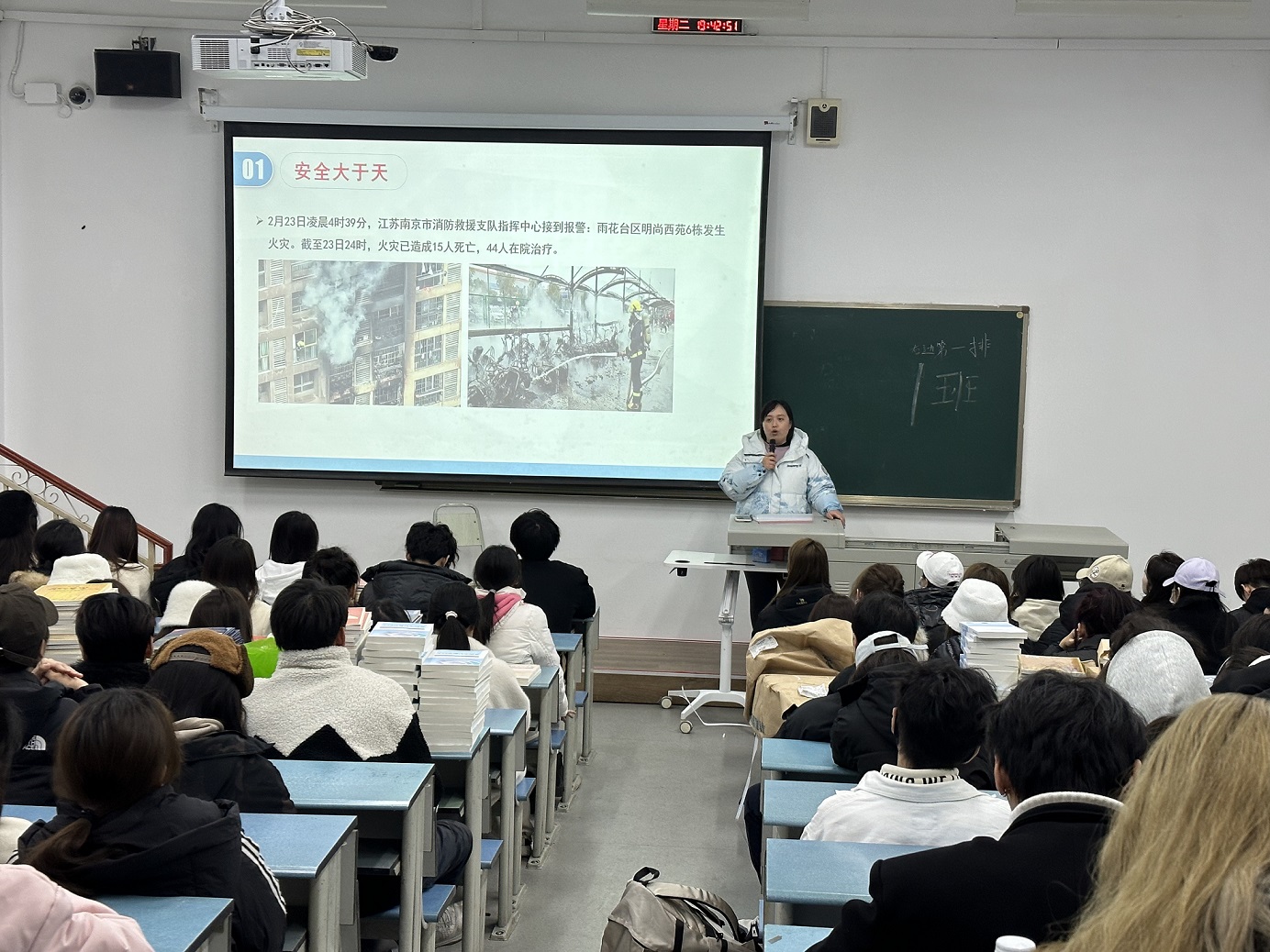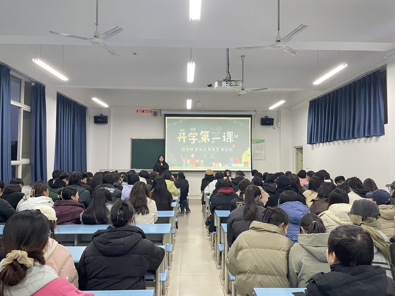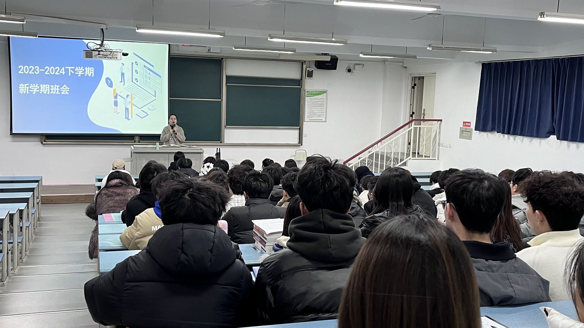 新学期的第一次班会,也是各位同学们的开学第一课。在班会上,辅导员老师向同学们介绍了学校近期的安排,包括教学、补缓考、重修课程、课表解读等等。结合假期国内发生的两起重大火灾事故,各位辅导员老师也将安全教育作为开学第一课的核心内容进行讲解。