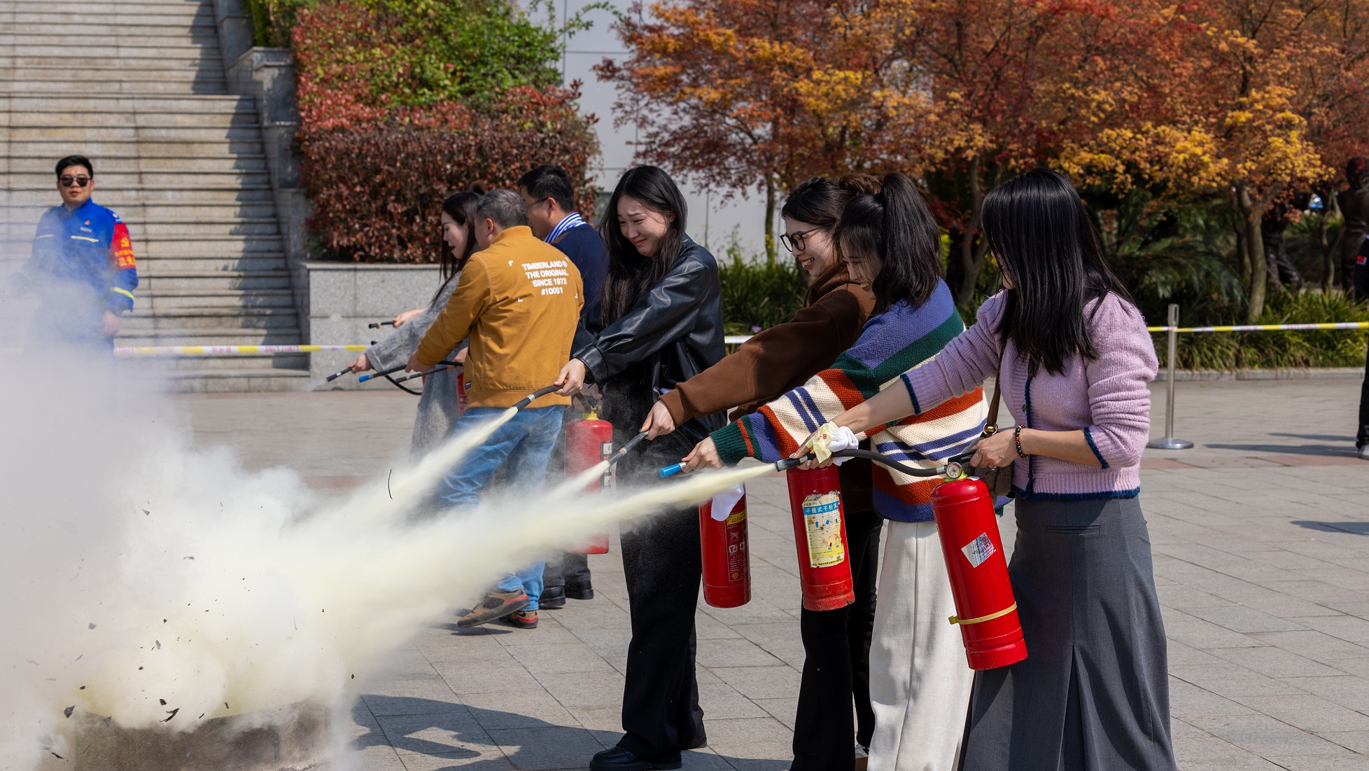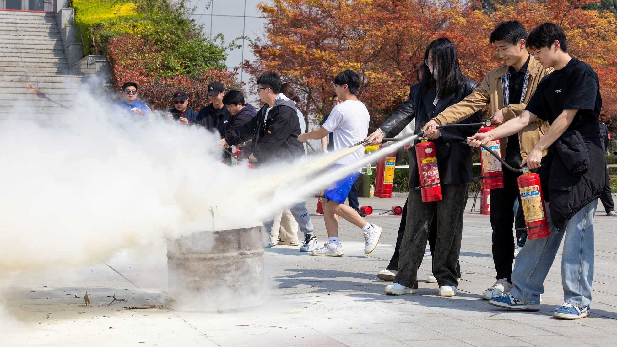 实操灭火体验区由蓝天救援队教官给大家讲解了灭火器材的种类、使用方法和注意事项,并现场演示了灭火器材的正确操作流程。分别让大家体验两种不同的灭火方式、操作不同类型的灭火器,师生员工踊跃参与,纷纷上前对现场模拟火点进行灭火操作,在教官的指导下,师生员工们成功使用灭火器完成灭火。