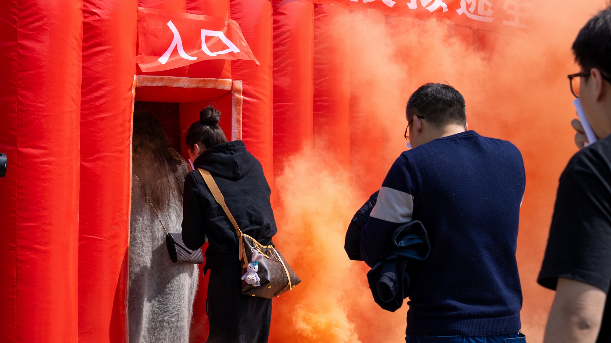 烟雾帐篷逃生体验区,为了让全体师生有更深刻切实的体验,内设有障碍,模拟室内道路不清、视线受限等场景,最大程度模拟火灾现场,实现了实景逃生演练的效果。在教官的指导下,大家用毛巾捂住口、鼻,弯腰、低头依次从“逃生体验屋”入口进入,并快速从出口撤离,进行了一次真实模拟火灾逃生疏散演练。
