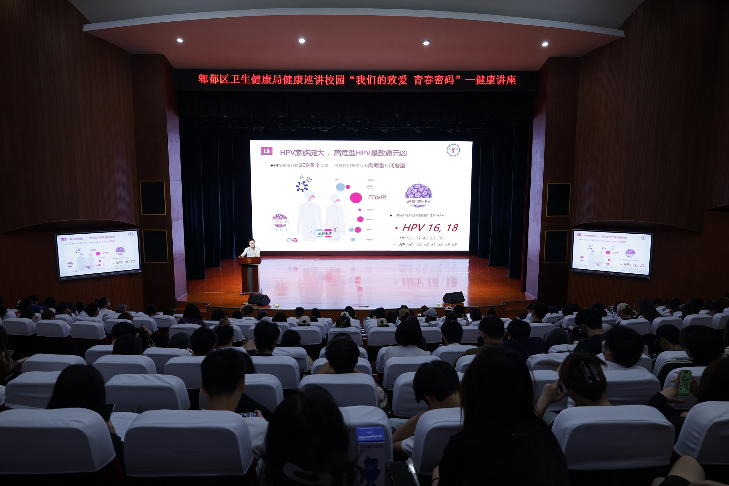 随后,宫颈癌综合防控志愿者刘义辉为在场的女同学们讲解了宫颈癌的危害以及预防措施,对目前宫颈癌疫苗的种类和政策也做了详细的介绍。