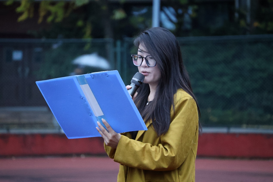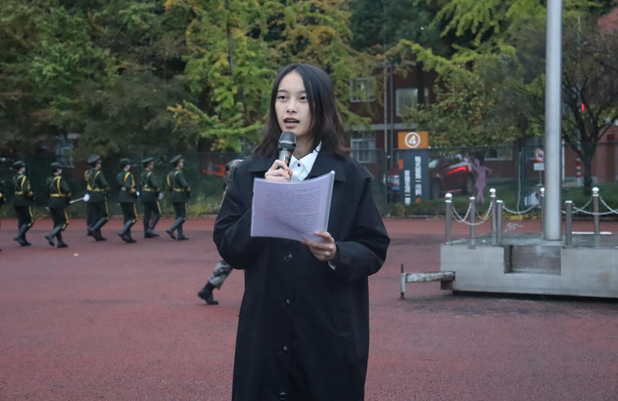 随后,由融合媒体学院2021级网络与新媒体本科02班的王子瑾同学在国旗下发表了热情洋溢的演讲。她用自身经历为引,告诉大家她坚定选择传媒的原因,我们将成为的是传递真实客观的信息、引导正确舆论方向、为正义发声的新闻人,呼吁大家要时刻铭记“做党和人民的耳目喉舌”这句话,去传递中国声音。