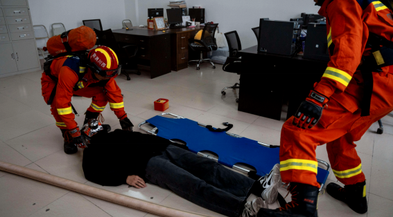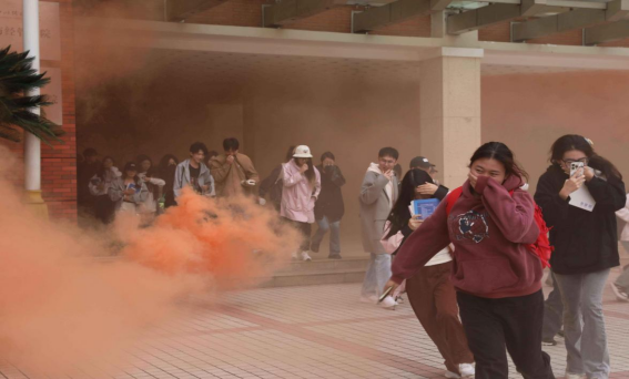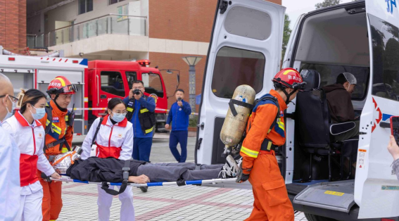 警报声响起,A2教学楼内正在上课的师生迅速进入应急状态,他们用毛巾捂住口鼻,快速且有序地从楼内撤离至安全区域,疏散过程有条不紊。微型消防站接到火警后,队员迅速响应,对起火点喷水操练。随后,郫都区消防救援大队专业救援力量进入模拟起火点,搜救受伤被困人员。医务组人员与消防救援人员协同配合,近十分钟后,明火熄灭,受困人员获救,演练结束,教学工作恢复正常。