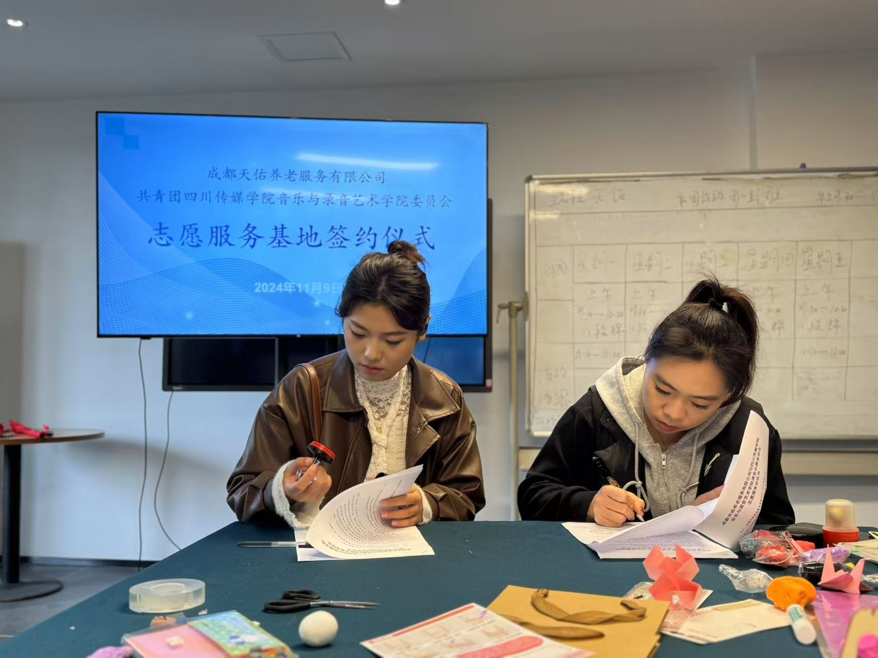 在岁月的长河中,每一位长辈都是时光的见证者和时代的建设者。为响应国家有关战略部署,进一步深入开展青年志愿者为老服务“金晖行动”。2024年11月9日,音乐与录音艺术学院清音志愿者协会在成都天佑养老服务有限公司,成功举办“纸艺时光,巧手绘情”主题志愿服务活动暨志愿服务基地签约仪式。