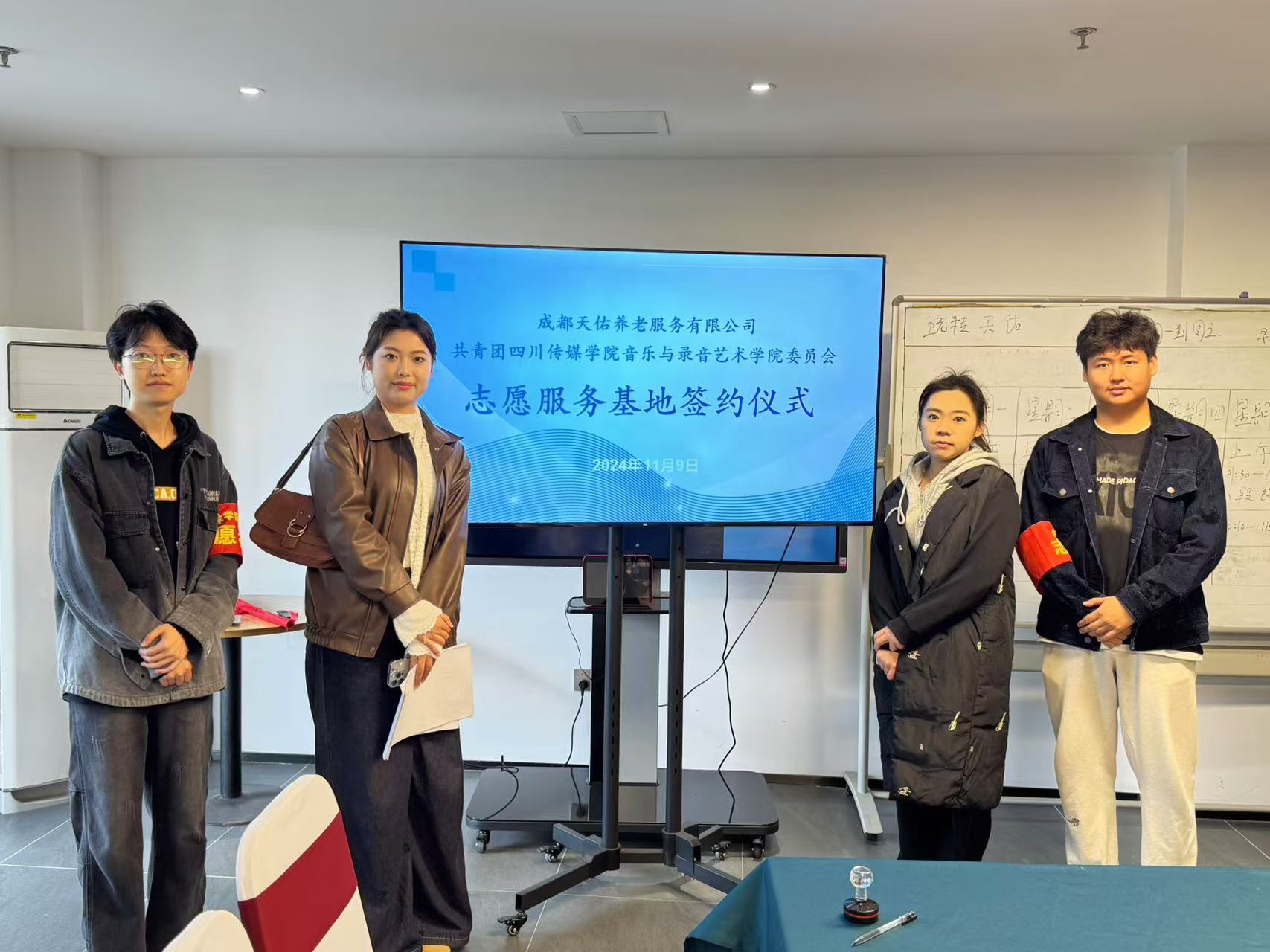 在本次充满意义的志愿服务活动中,共青团四川传媒学院音乐与录音艺术学院委员会携手成都天佑养老服务有限公司,正式签署合作协议,共同踏上了一段旨在弘扬“尊老爱幼”美德的温情之旅。双方将凭借各自的专业优势与技能,为社会贡献年轻的力量,让这份源自心底的大爱,在青年一代中薪火相传,温暖并激励着整个民族的灵魂。