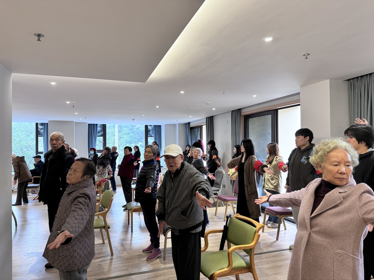 九时三十分,志愿者们与老人们相聚一堂,共同投入到八段锦的晨练之中,动作整齐划一,洋溢着活力与和谐。紧接着,他们又一同步入了手指操的轻松节奏,手指灵活翻飞,编织出一幅幅温馨的画面。老人们个个精神矍铄,笑容满面,仿佛岁月在他们身上留下了智慧而非沧桑。整个现场洋溢着一种难以言喻的欢乐与融洽,空气中弥漫着轻松愉悦的气息,让人心生暖意。