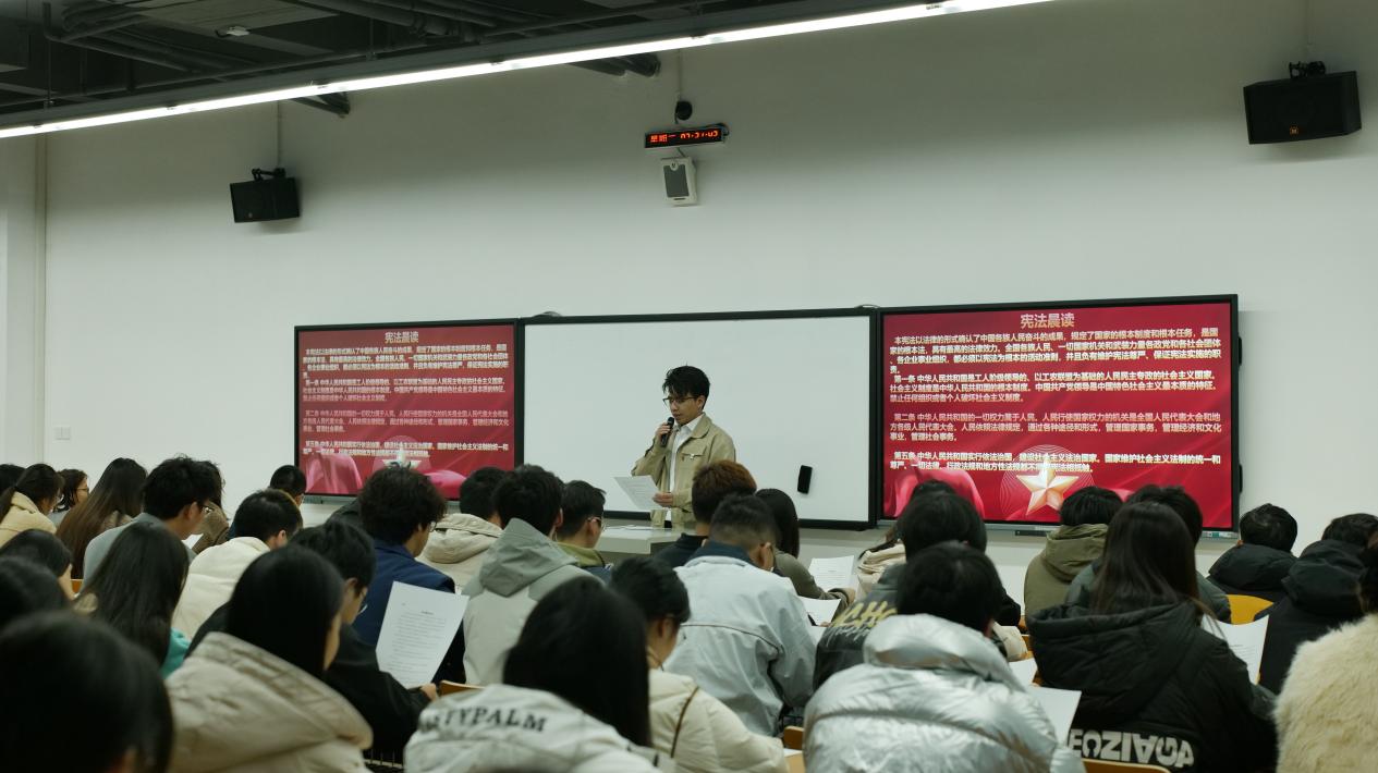 为深入学习贯彻党的二十届三中全会和全国教育大会精神,学院积极响应国家加强宪法学习宣传教育的号召,进一步提升同学们的法治素养和宪法意识,并于2024年12月3日在A12-410教室组织了“学宪法 讲宪法”晨读活动。智慧广电学院正式党员、预备党员及入党积极分子和团支书干部全员参与。