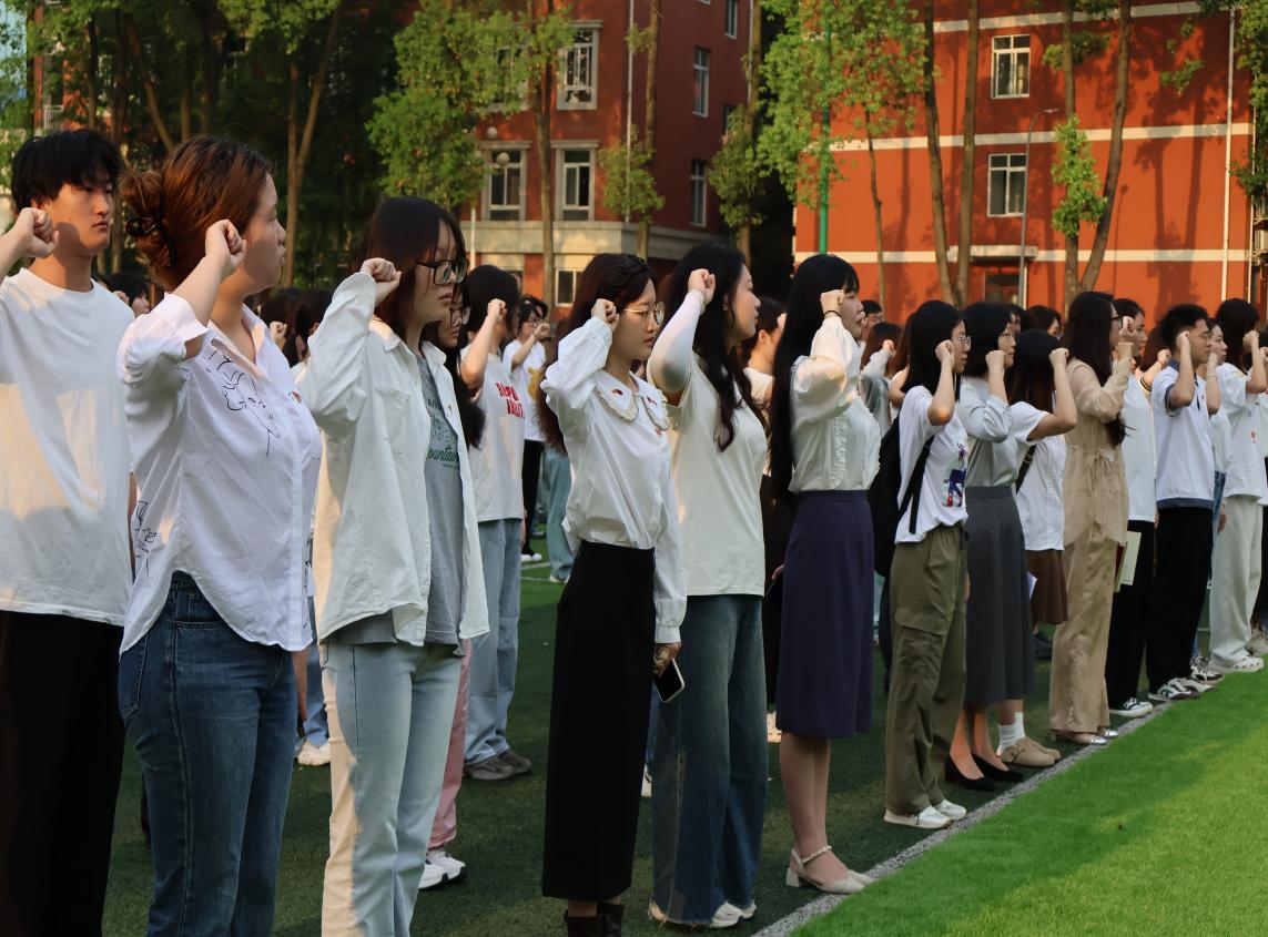 升旗仪式结束后,融合媒体学院学生会执行主席刘冬雪代表全体学生上台发言。她回顾了过去几年在学院的研学活动,诉说了新闻人的敏感和温度,分享着其中收获的专业知识和对生活的感动。她鼓励同学们不负青春,将个人理想融入时代洪流,让我们的笔尖流淌真相,让镜头定格温度,用汗水为自己书写出一篇无悔的答卷。随后,她带领师生们在国旗下庄严宣誓,师生们整齐划一地举起右手,声音洪亮而坚定,每一个字都饱含着对未来的憧憬与决心,铿锵有力的誓言在校园上空久久回荡。