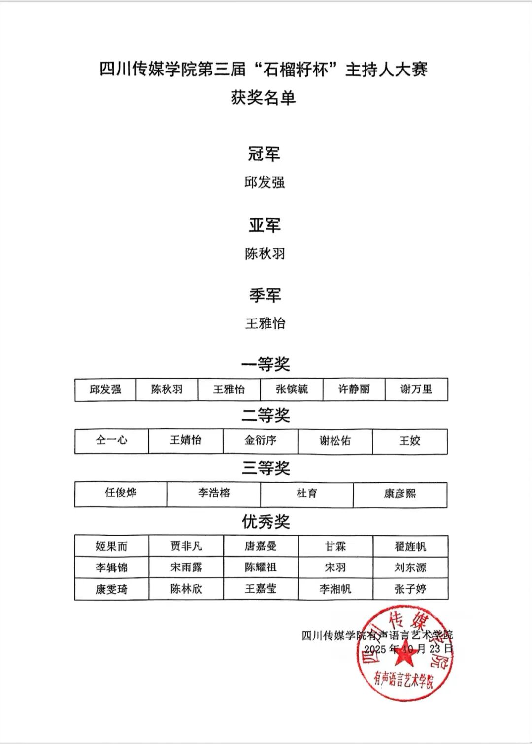 10月23日晚,四川传媒学院第三届“石榴籽杯”主持人大赛决赛圆满落下帷幕。本次比赛由四川传媒学院主办,有声语言艺术学院承办,首次采用校企合作比赛模式,与文旅行业领军企业“携程旅行”强强联合。