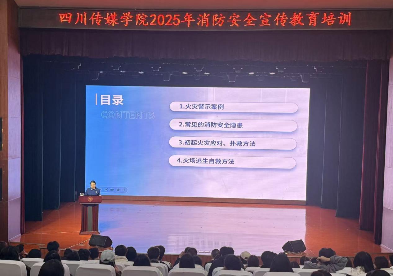 为切实筑牢校园安全防线,提升全体师生消防安全素养,在第34个全国消防日来临之际,保卫工作部于11月4日邀请郫都区消防救援大队宣传骨干、公益培训讲师林小岚同志到校,开展“全民消防、生命至上——安全用火用电”主题消防知识专题培训。学校党委常委、校长助理唐杰、保卫工作部部长黄华、学生工作部部长张颖、设备管理处处长杨高山、后勤管理处处长谢磊以及各院系师生代表共300余人参与培训。