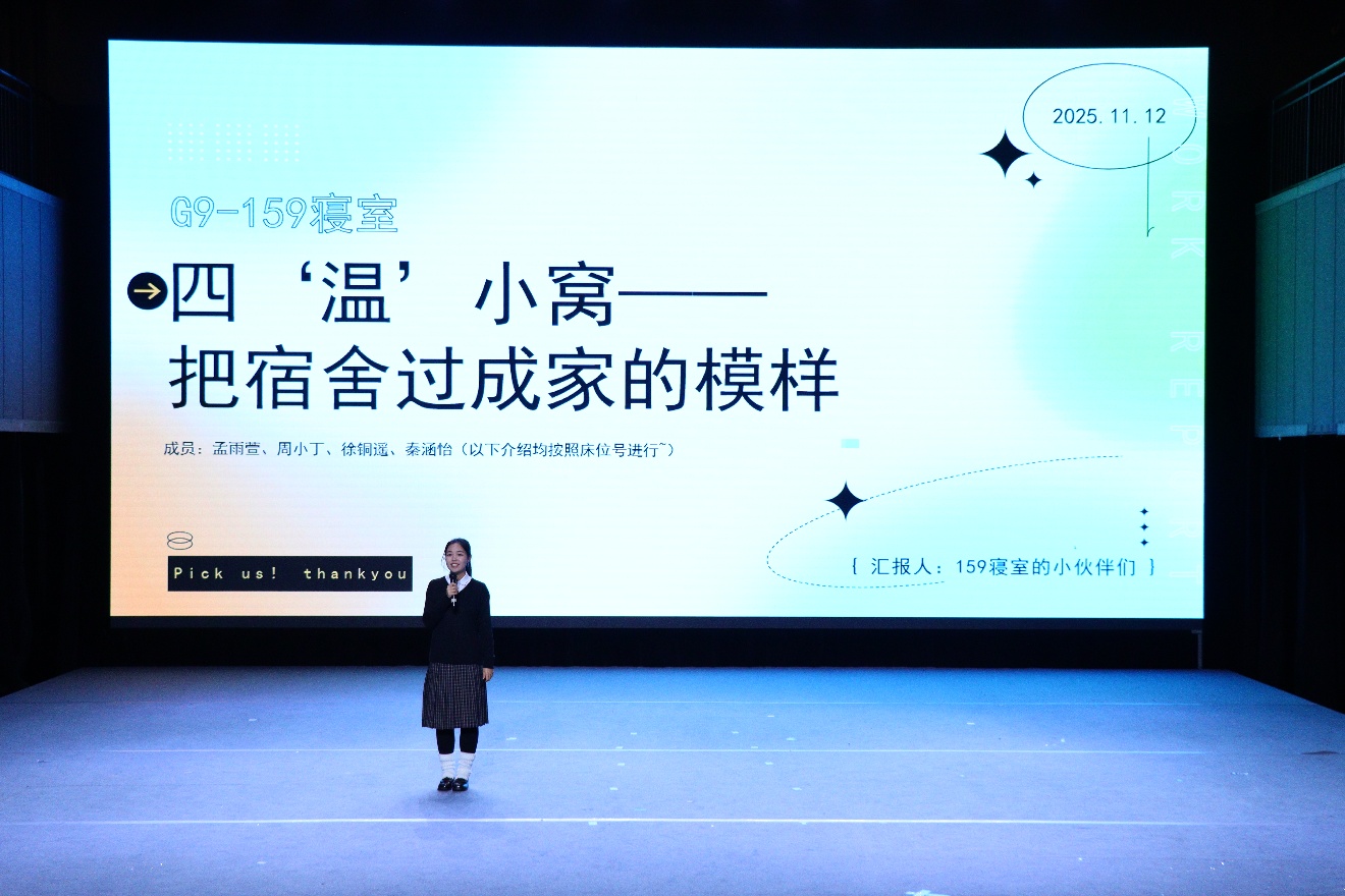 作为学校推进美育教育、营造和谐校园的重要载体,本次活动经各学院严格筛选、择优推荐的初评环节,12 间寝室凭借鲜明文化特色与学业成果脱颖而出。决赛以现场答辩形式展开,各寝室代表在三分钟限时展示中,借助 PPT 与视频,全面呈现寝室文化、环境卫生、室友情谊、安全规范、学业规划及文明礼仪等亮点。鲜活的生活场景、流利的表达与独特的文化氛围,赢得现场阵阵掌声。